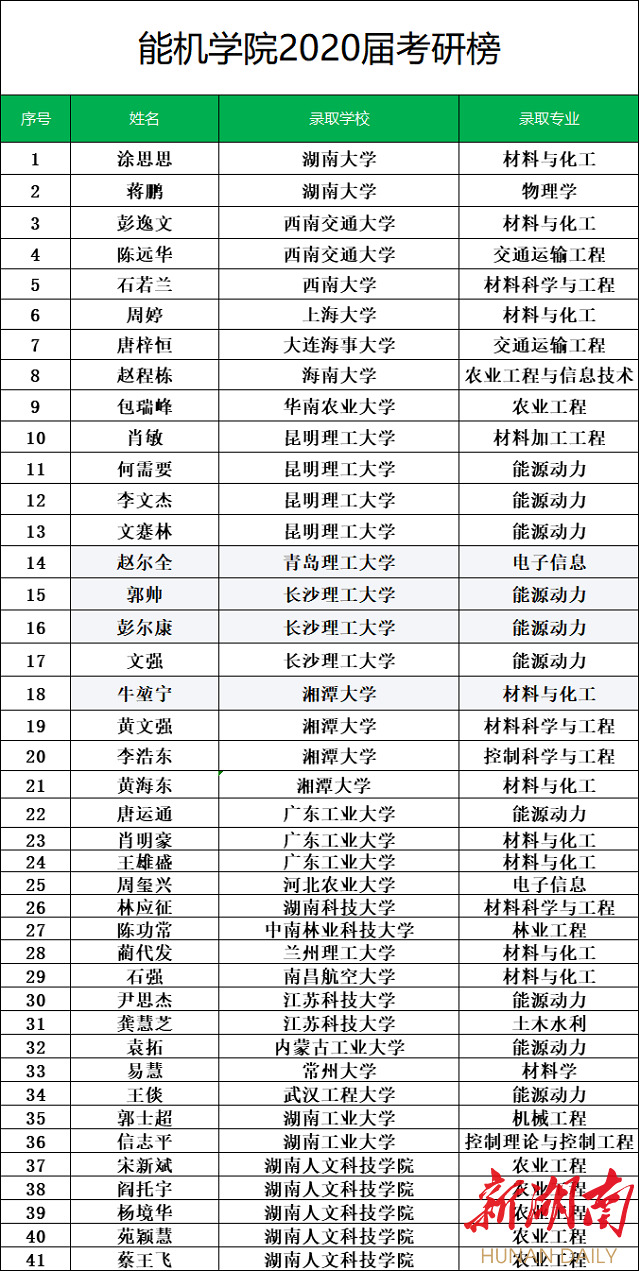 湖南日报·新湖南客户端9月11日讯(通讯员 邓景文)日前,KY开元集团官网入口能源与机电工程学院(以下简称“能机学院”)传来喜讯,2020年应届毕业生考研,56人上线,41人被湖南大学、西南交通大学、西南大学等多所全国知名院校录取。近两年,学院应届毕业生考研上线122人,总共录取91人。