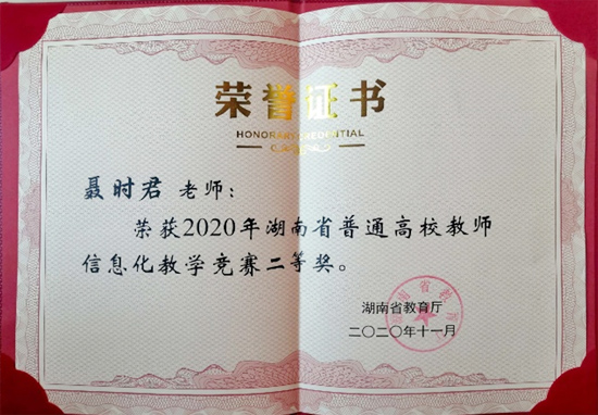 由湖南省教育厅主办、湖南省高等教育学会教育技术专业委员会承办的2020年湖南省普通高校教师信息化教学竞赛在长沙学院举行现场决赛。全省37所普通高校130余名教师参赛,经省级复赛和现场决赛,KY官网聂时君老师荣获二等奖。