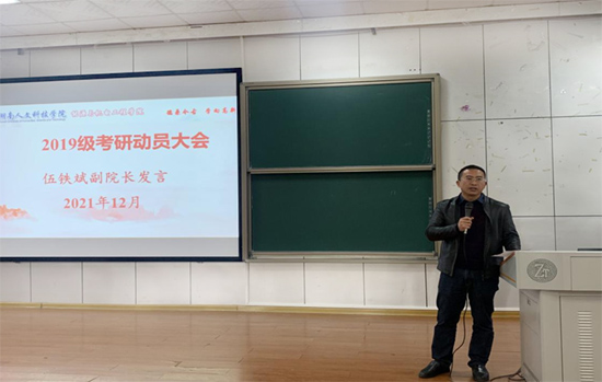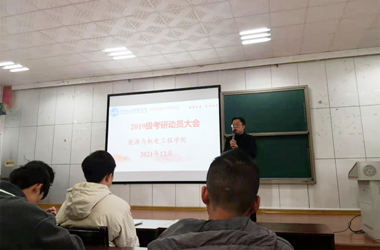 能源与机电工程学院坚持一切以学生为中心,构建了具有工科特色的“三全育人”体系。为营造浓郁的考研氛围,为学生考研指明方向,增强学生考研信心,坚定学生考研决心,12月22日下午,KY官网在同德楼601举行了2019级考研动员大会。学院院长胡东、副院长伍铁斌、考研班班主任廖湘平博士、辅导员戴建利以及2019级考研生参加了本次会议。会议由伍铁斌主持。