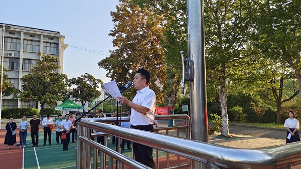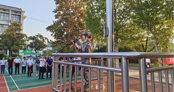 迎着朝阳,国旗护卫队迈着整齐的步伐护送国旗走向升旗台。伴随着庄严雄壮的国歌,鲜艳的五星红旗在晨曦中迎风飘扬,在场的每一位师生面向国旗行注目礼,爱国之情和强国之志在心中激荡。