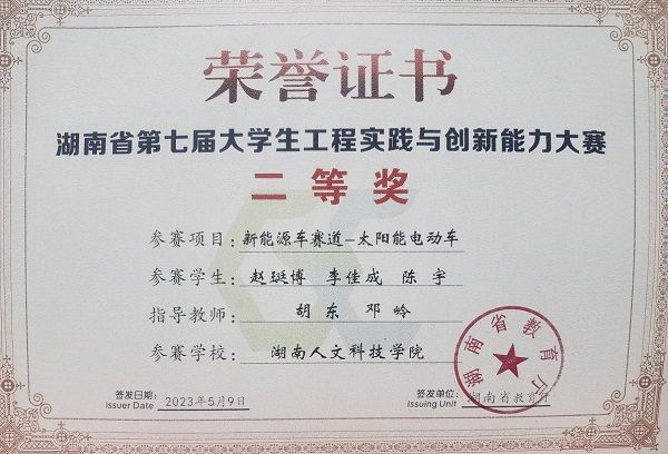 2023年获得湖南省第七届大学生工程训练大赛省级二等奖。