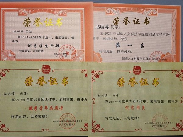 赵珽博是一个热爱生命有着自己的梦想的人,他有着一颗热心肠,以热散光,辉映周遭,传递温馨之焰。他作为当代青年及中共党员,他深切铭记志愿服务之精髓,全心全意为人民服务,主动融入助人为乐之实践活动,致力于缓解周围个体遭遇的挑战与不便。在学校中,他频繁帮助老师整理学术资源,应对突发事件于力所能及范畴内,介入同窗在认知发展、学术探索及日常生活层面的各类难题,他主动开展对话,为身边的朋友排忧解难。在其师长视角中,他是学业楷模;于同窗心中,他是挚友般的存在,持续不断地以温情滋养周围个体的心田。在足球比赛中他团结队友是比赛场上的大心脏。