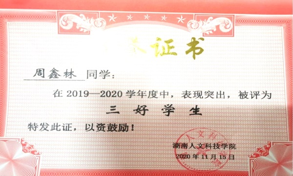 “要实学实干,脚踏实地、埋头苦干,孜孜不倦、如饥似渴,在攀登知识高峰中追求卓越,在肩负时代重任时行胜于言,在真刀真枪的实干中成就一番事业”。初来大学,周鑫林脑子里想的是好好放松从重压下解放出来的自己,然而很快他就明白了,大学仍需努力认真的学习。由于大学的授课已不再像高中时填鸭式那样,而是一节课讲述很多知识,只靠课堂上听讲是完全不够的。这就要求在课下练习巩固课堂上所学的知识,须自己钻研并时常去图书馆查一些相关资料。日积月累,自学能力得到了提高。再有就是懂得了运用学习方法同时注重独立思考。要想学好只埋头苦学是不行的,要有方法,做事情的方法。