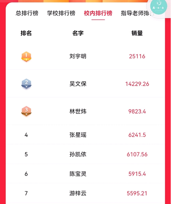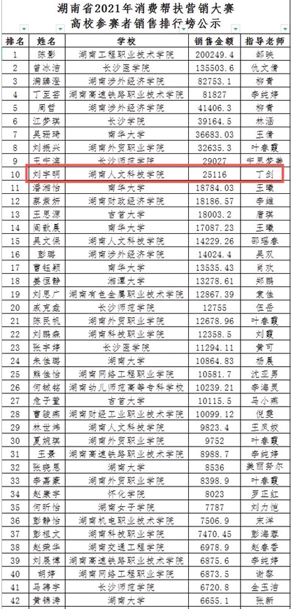 近日,湖南省2021年消费帮扶营销大赛高校参赛者排行榜公布,KY官网学子刘宇明,经过激烈的比拼,最终在数千名参赛选手中脱颖而出,以25116元的销售金额,勇夺本届大赛季军(全省第10名),展现了KY官网学子高超的营销技能水平和优良素质。