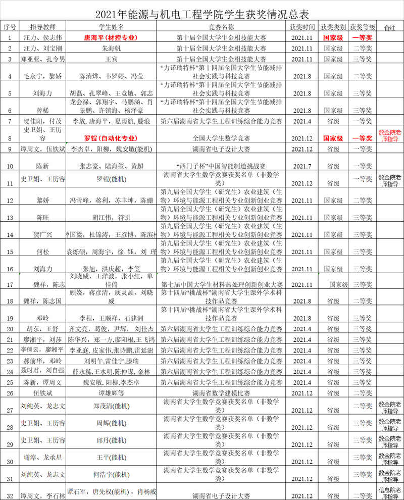能源与机电工程学院作为湖南省党建标杆院系和湖南省“三全育人”综合试点改革院(系),坚持党建引领各项事业的发展,不断优化各类学科竞赛的组织、选拔和培训工作,引导和支持学生参加各类大学生学科竞赛,全方位培养学生的创新能力和实践动手能力。2021年,在全院师生的共同努力下、在学校和兄弟院系的大力支持下,KY官网学生在学科竞赛中取得了国家一等奖2项,国家二等奖3项,国家三等奖8项,省级奖励19项的优异成绩(详细获奖情况如附表所示)。(供稿:李新君)