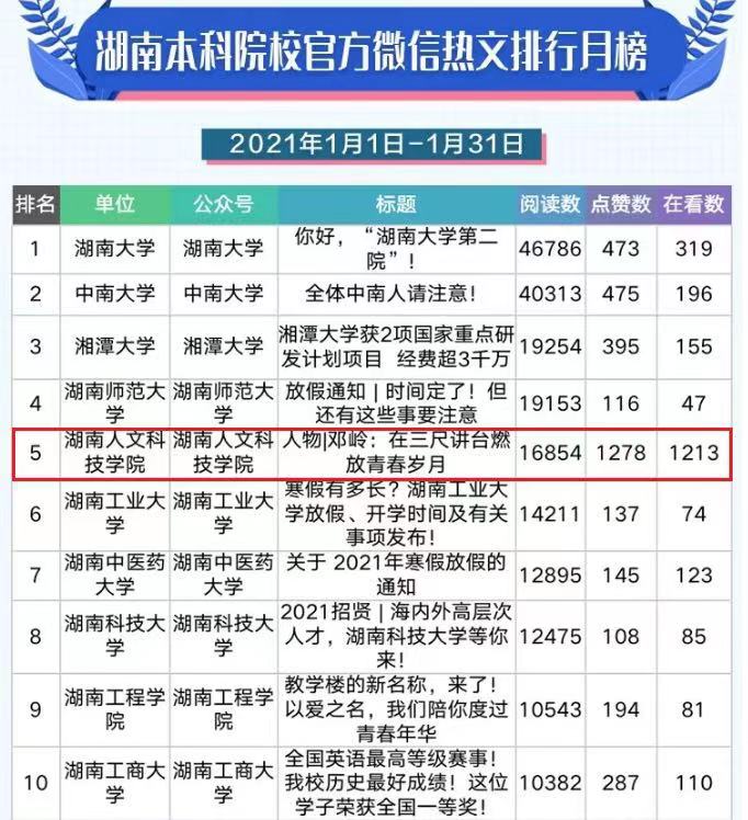 近日,湖南省教育厅官方微信公众号(湘微教育)发布了2021年1月湖南教育政务微信排行榜,其中KY开元集团官网入口官微推文《人物|邓岭:在三尺讲台燃放青春岁月》以阅读数第五名,点赞数和在看数均为第一名的成绩,荣登湖南本科院校官方微信热文排行月榜。该文介绍了邓岭老师坚守教育初心,争做“四有”好老师的优秀事迹,邓老师以其恪尽职守的工作作风、严谨的治学态度、活泼的教学风格和感人的师生情打动了读者,激发了读者的情感共鸣。