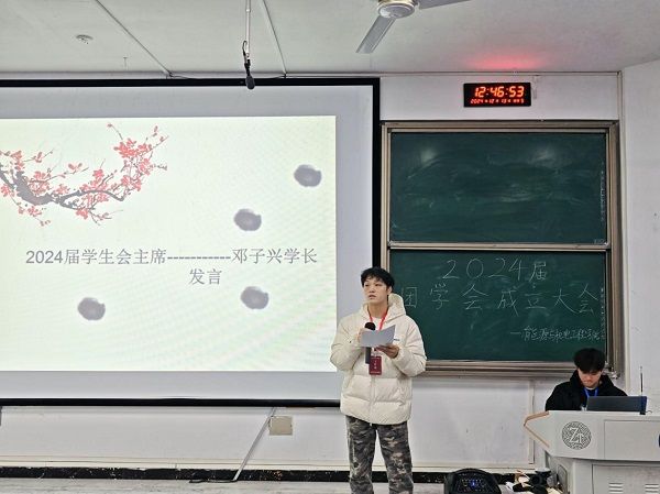 随后,学生会主席成员代表邓子兴详细介绍了学生会秉承“服务同学,共同成长”的宗旨、下设六大职能部门的基本情况以及各部门年度情况。并表示在新的一年中将持续推进团总支学生会建设,完善组织职能,促进部门工作与职责协调,让新一届团总支学生会在创新驱动下展现新气象。希望新一届团总支学生会成员可以共同努力,共同进步,共面挑战,共创佳绩。