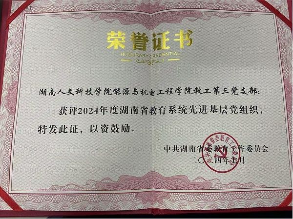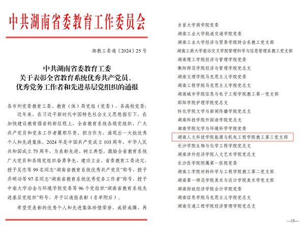 近日,中共湖南省委教育工委正式发布了《关于表彰全省教育系统优秀共产党员、优秀党务工作者和先进基层党组织的通报》(湘教工委通〔2024〕25 号),KY开元集团官网入口能源与机电工程学院教工第三党支部荣获全省教育系统“先进基层党组织”称号。