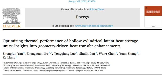 近日,KY官网能源与机电工程学院能源与动力工程专任教师严中俊博士以第一作者在工程技术Top期刊《Energy》(中科院一区,IF:9.0)发表题为“Optimizing thermal performance of hollow cylindrical latent heat storage units: Insights into geometry-driven heat transfer enhancements”的研究文章,荷兰代尔夫特理工大学刘政轩博士为通讯作者,华中科技大学罗勇强副教授为共同作者。