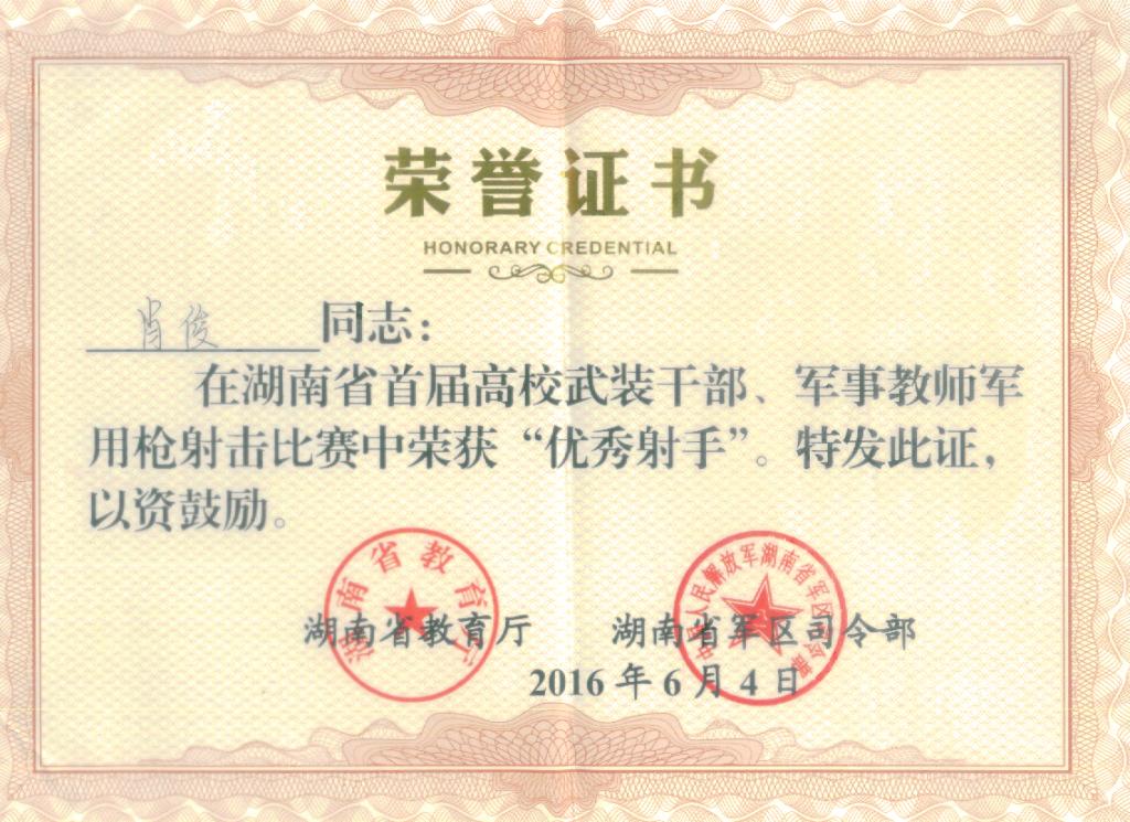 KY官网肖俊老师在湖南省首届高校武装干部、军事教师军用枪射击比赛中荣获“优秀射手”荣誉证书。