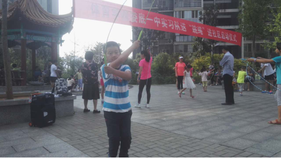 启动仪式上,主管教学的副院长曾黎发表了讲话,高度肯定娄底一中实习队组织的这次活动。认为体育进社区是一种新的思路,为我们今后的教育教学改革和校企合作教育提供了样板。另外跳绳可以训练人的弹跳、速度、平衡、耐力和爆发力,同时还可以锻炼机体的准确性、灵活性、协调性,以及顽强的意志和奋发向上的精神。最后他鼓励大家多跳绳。然后业主委员会主任金乐教授发表了热情洋溢的讲话,代表全体业主对这次送“跳绳”进社区的活动表示热烈的欢迎,她从女性的角度诠释了跳绳的魅力,认为跳绳是一项很有效的有氧减肥运动,通过跳绳不仅可以强身健体,还能有效训练个人的反应和耐力,有助保持个人体态健美,从而达到强身健体的目的,另外活动能丰富南风苑社区业主和儿童体育文化生活。最后表示感谢体育学院,感谢娄底一中实习队的辛勤付出,感谢王金稳老师的精心组织。