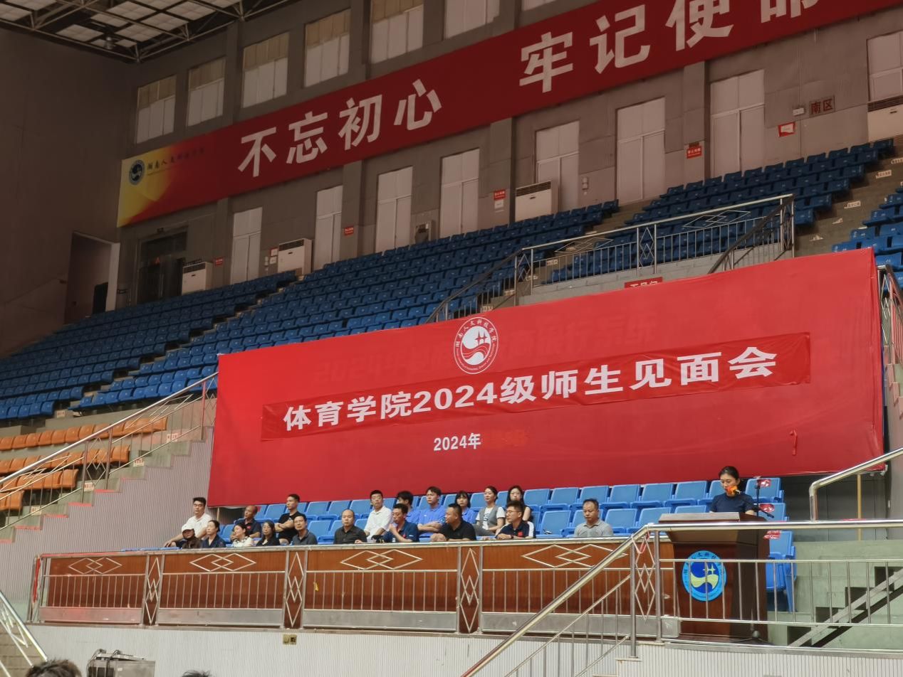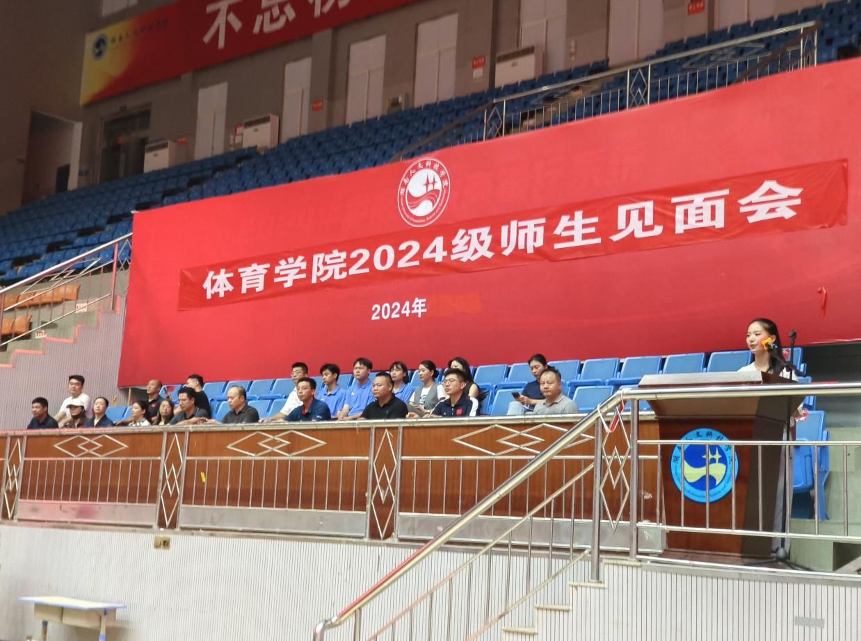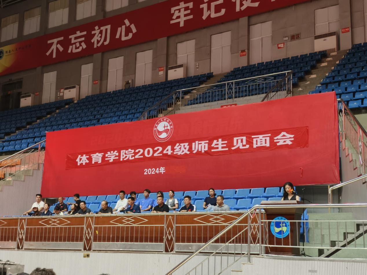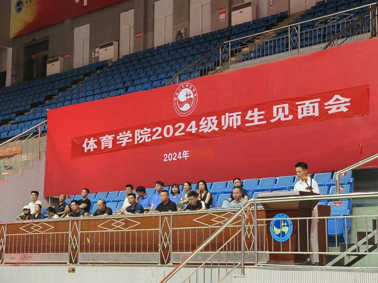 金秋九月,喜迎八方学子。在这金秋送爽、硕果累累的季节里,体育学院迎来了一群朝气蓬勃的2024级新同学。9月14日晚上19:00,体育学院在体育馆召开了“相遇新起点,一起向未来”为主题的新生见面会,开启了一场关于未来与梦想的会面。此次会议体育学院全体党政班子、辅导员、新生班主任、助理班主任出席会议,会议由、学院党总支书记曾黎主持。