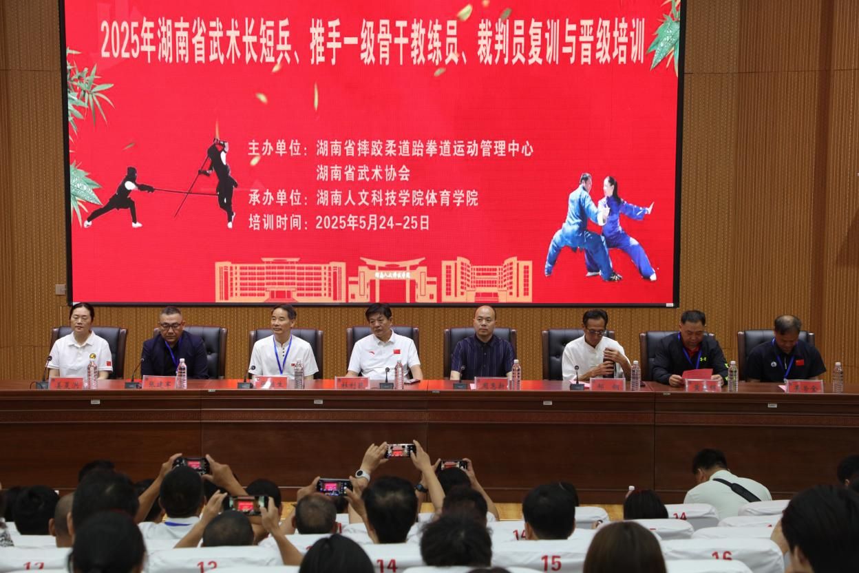 5月24日,KY开元集团官网入口匠成楼报告厅内气氛热烈,2025年湖南省武术协会长短兵、推手一级骨干教练员、裁判员晋级与复训班开班典礼在此举行。来自全省14个市州的75名高级武术教练员、高校教师及武术裁判员齐聚一堂,共同开启为期三天的专业淬炼之旅。此次培训由湖南省武术协会主办,KY官网体育学院承办,标志着湘中地区武术人才培养体系迈入新阶段。
