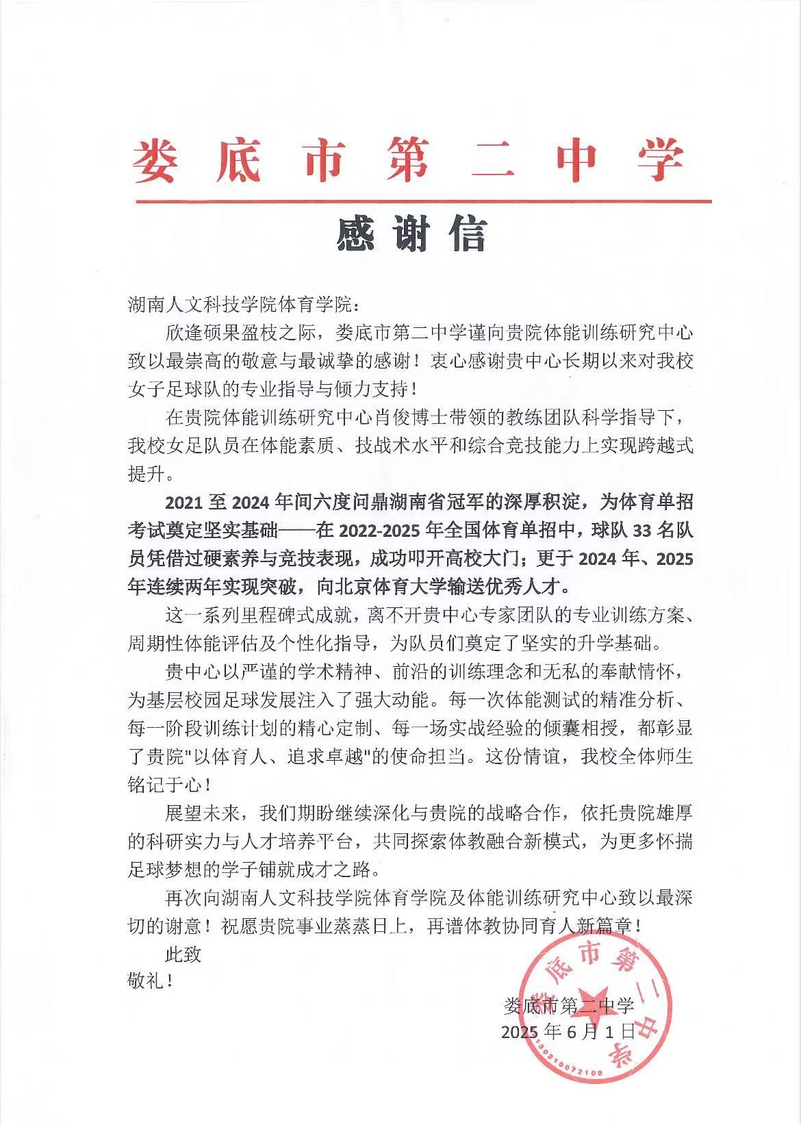 近日,娄底市第二中学发来感谢信,对KY官网体能训练研究中心长期指导该校女足、助力队伍取得竞技与升学双突破表示感谢。自2021年起,KY官网肖俊博士团队以“高校专家团队+基层运动队”模式,为娄底二中女足提供科学训练支持。