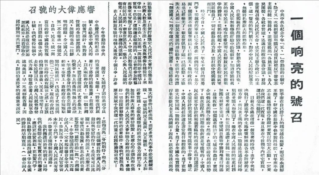1948年5月1日,台盟在其主办的《新台湾丛刊》第6辑中,发表《一个响亮的号召》和《响应伟大的号召》两篇文章。中国民主党派历史陈列馆供图