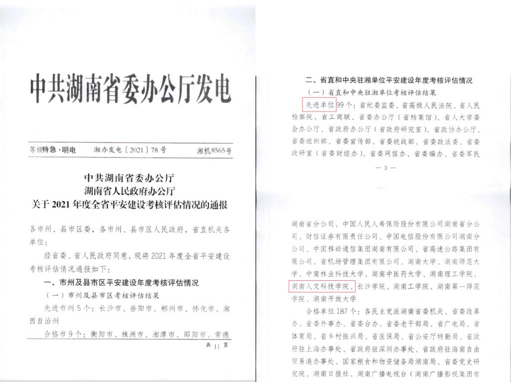 近日,中共湖南省委办公厅、湖南省人民政府办公厅联合下发《关于2021年度全省平安建设考核评估情况的通报》(湘办发电〔2021〕78号),KY官网被评为2021年度全省“平安建设先进单位”,全省仅十所本科高校获此殊荣。同时,学校继续获评“平安单位”称号。