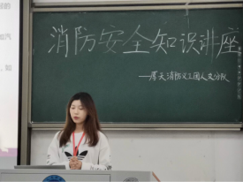 厚天消防义工团人文分队讲师团部长张嘉雯对消防安全知识进行系统讲解。向同学们普及了火灾的危害、类型及相应的灭火方式和注意事项;演示了干粉灭火器、消防栓和灭火毯等灭火器材的使用方法及注意事项,并现场邀请同学上台互动操作;最后讲解了遭遇火灾后如何正确逃生,并演示了防毒面罩的正确使用方法。