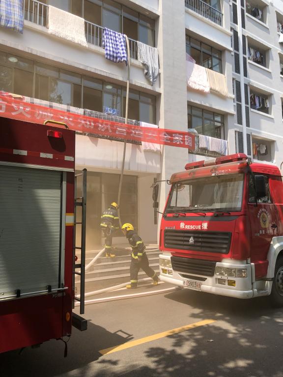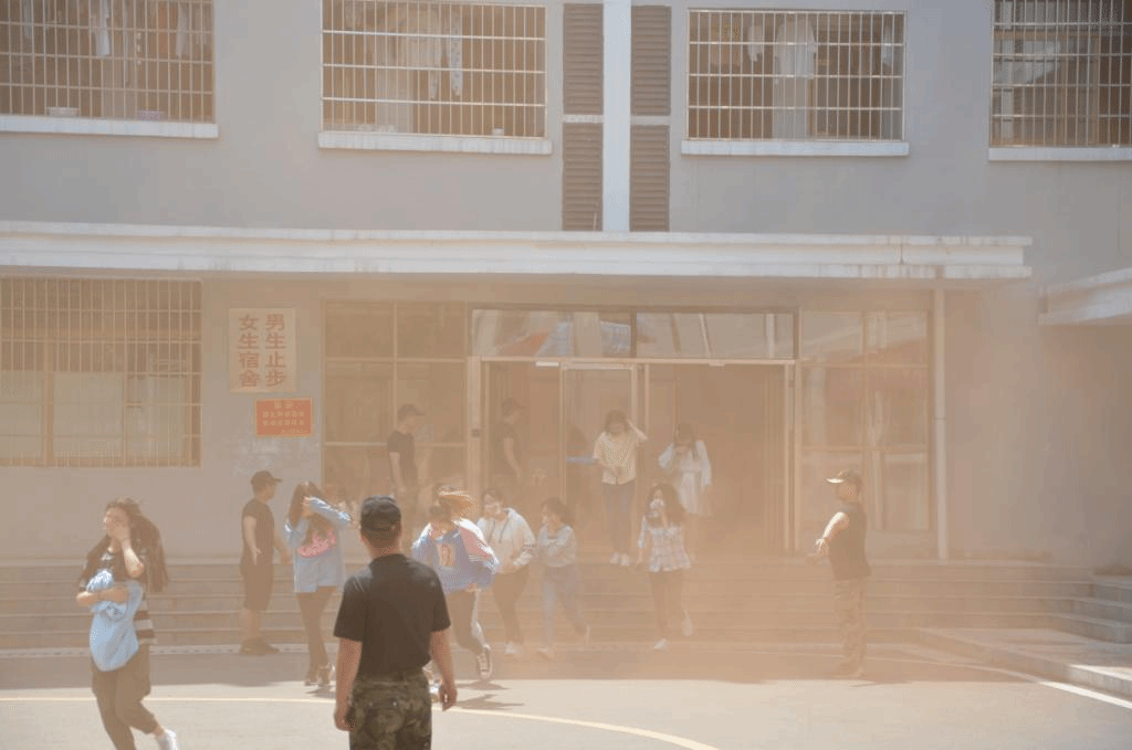 13点50分,第8栋学生宿舍楼突然冒出滚滚浓烟,火灾警报声骤然响起,由保卫处工作人员、二级学院辅导员、厚天消防义工团队员组成的应急疏散小组按照应急演练预定方案迅速进入到各楼层指定位置,紧急指挥学生往安全出口方向进行疏散。虽然第8栋学生宿舍结构复杂,但疏散过程紧张有序,未发生踩踏和受伤事故,短短几分钟时间,近2000名学生从安全出口撤离至应急避难场地。清点人数后,在场师生观摩了消防救援支队进行灭火演练与高空救援演练。