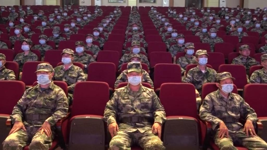 全体基干民兵配戴口罩间隔入坐