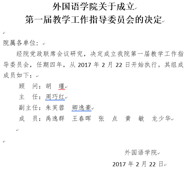 关于成立外国语学院第一届教学工作指导委员会的决定