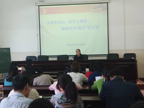 胡瑾从“为中国人民谋幸福、为中华民族谋复兴”的共产党的初心和使命出发,通过守初心,积极作为;担使命,加强建设;抓落实,持续发展三个方面,详细讲述了如何做新时代有理想信念、有道德情操、有扎实学识、有仁爱之心的“四有”好老师。