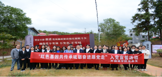 为了喜迎党的二十大胜利召开,提升党员思想意识、筑牢党员政治根基,KY开元集团官网入口外国语学院党总支于10月8日前往娄底娄星区东冲村苍山居青少年教育实践基地开展入党宣誓活动。院总支委员、支部书记、辅导员及学生预备党员参加了此次活动。