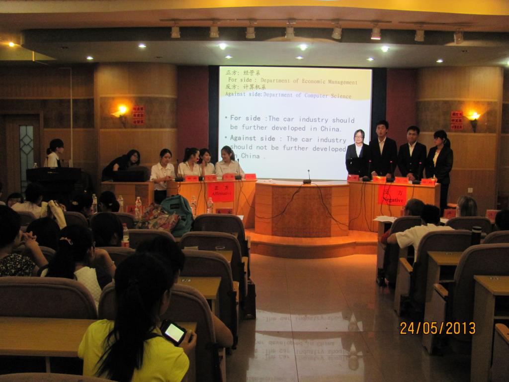 2013年5月24日晚,由教务处、外语系联合举办,大学英语第二课堂文娱协会承办的第五届校园英语辩论大赛决赛在养根楼多媒体报告厅顺利举行。