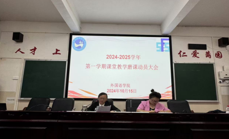 为了迎接教育教学审核评估,规范课堂教学行为,聚焦课程的高阶性、创新性、挑战度,全面提升教师课堂教学能力和水平,10 月15日下午,外国语学院于播馨楼406会议室召开2024-2025学年第一学期课堂教学磨课动员大会,李霞书记主持,全体教职工参加。