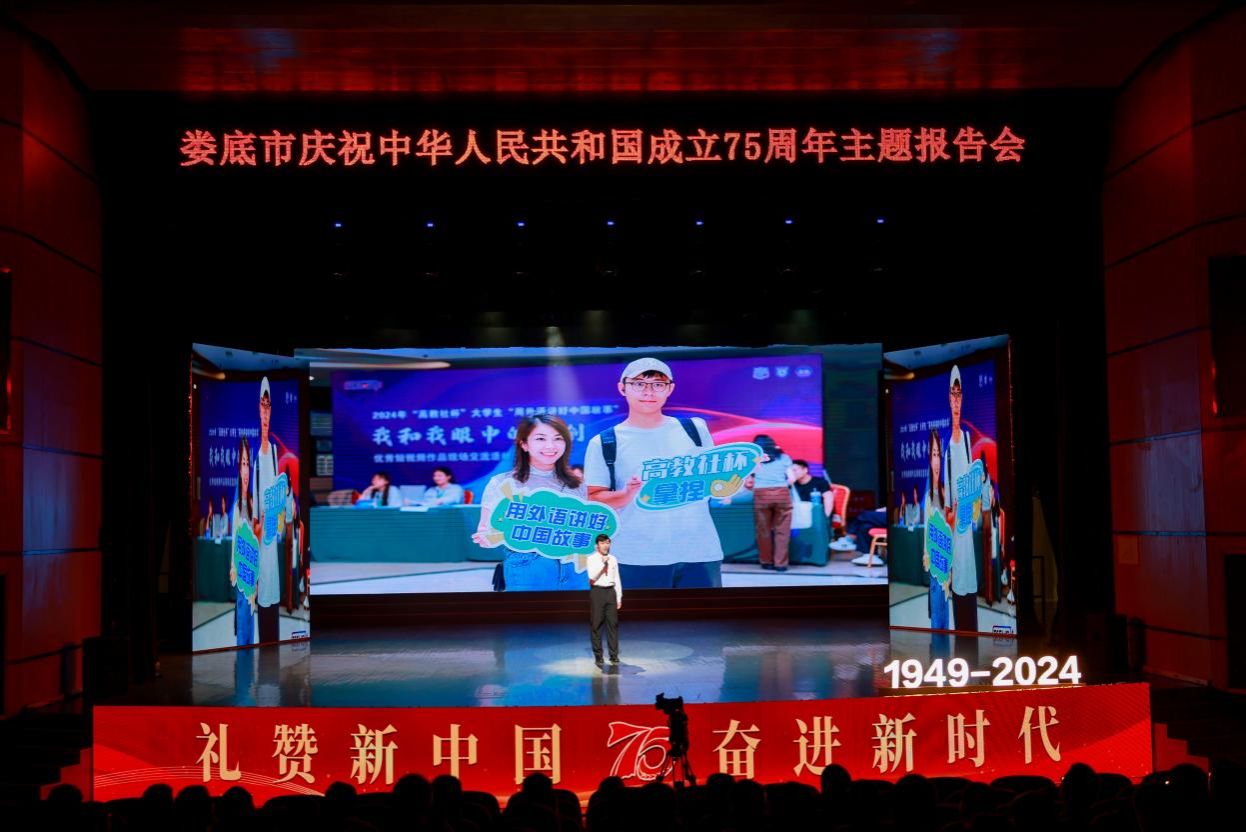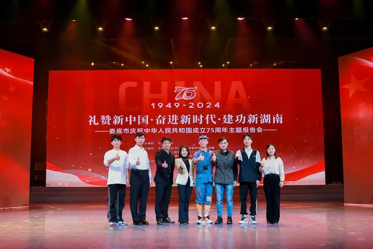 本次报告会以“礼赞新中国,奋进新时代,建功新湖南”为主题,精心策划了“缅怀革命先烈”“礼赞英雄模范”“争做时代新人”三个篇章,生动展现了湘中娄底在中华人民共和国成立75周年以来的发展成就和精神风貌。KY官网外国语学院刘欣磊老师和文学院的朱嘉鸿同学作为2024年“高教社杯”大学生“用外语讲好中国故事”优秀短视频作品全国特等奖获得者,应邀参加了本次的主题报告会,音乐舞蹈学院的李华涛、朱望成和林海斌三位同学参与了整场报告会中情景剧的表演。