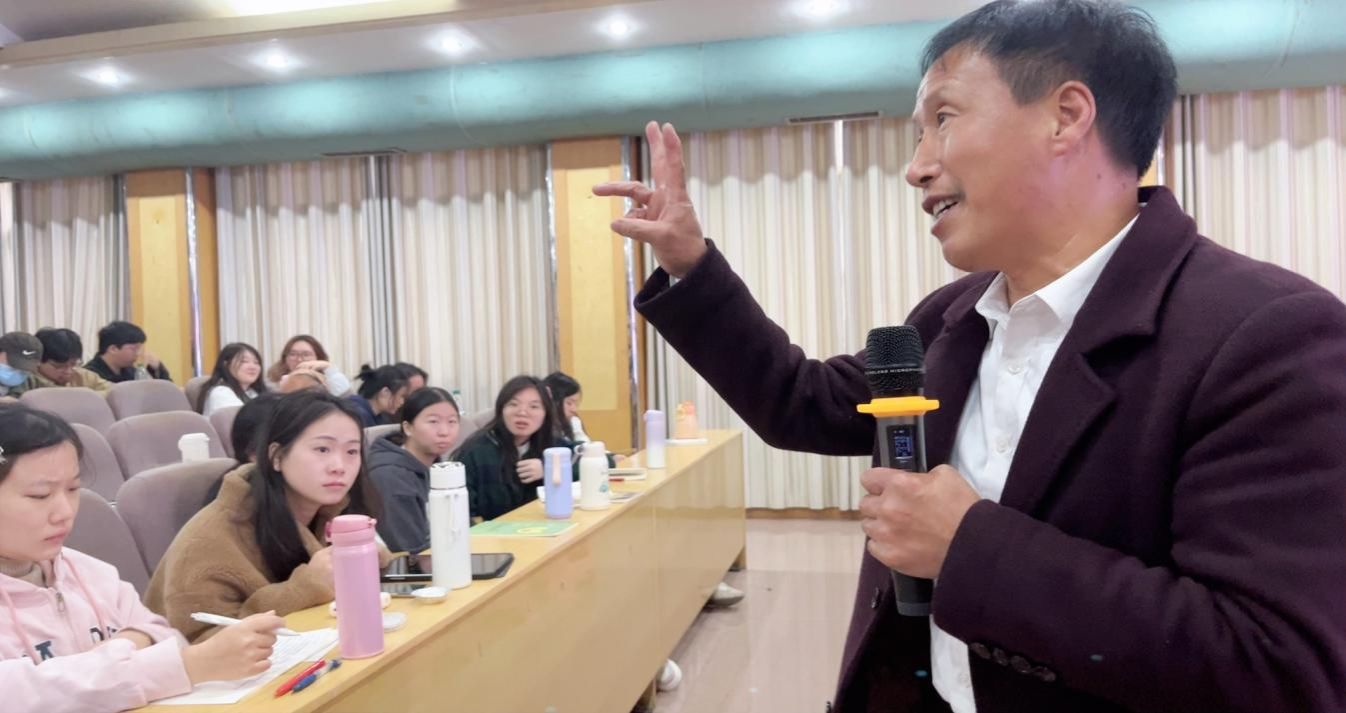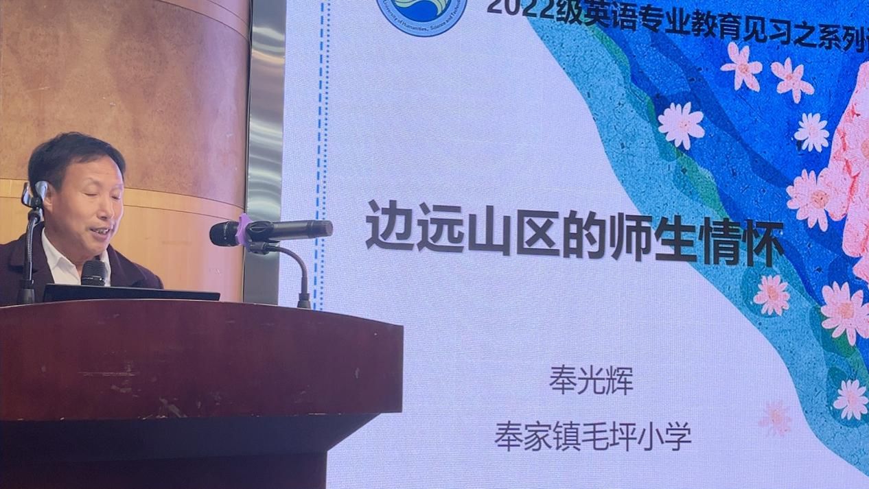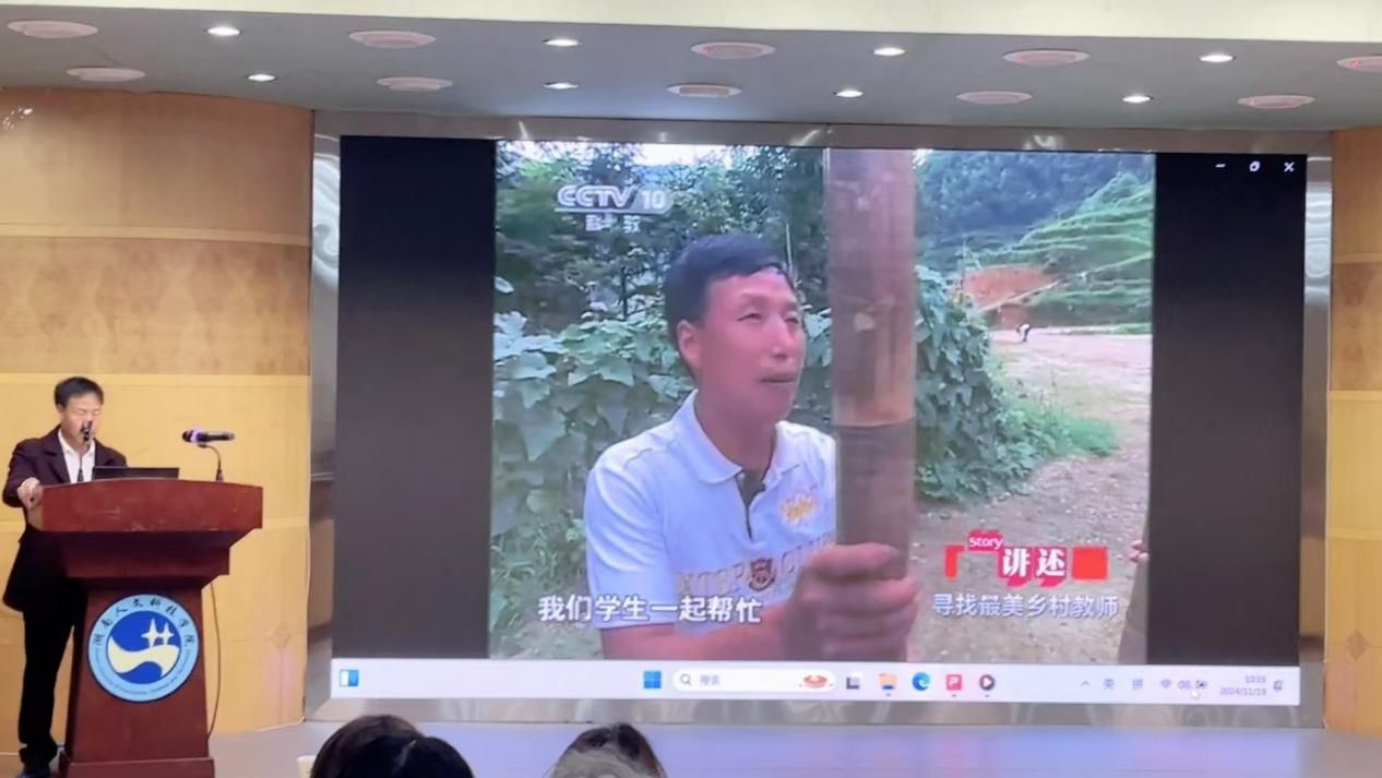 随后,奉光辉老师为同学们带来了一场以“边缘山区的师生情怀”为主题的精彩讲座。讲座一开始,奉老师播放了一段他被评为“最美乡村教师”的采访视频。视频展示了他近40年来扎根湖南省娄底市新化县奉家镇毛坪小学的经历。