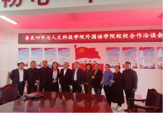 娄底市第四中学是KY官网省级英语师范生创新创业教育基地,为进一步推进基地建设,2021年10月14日,基地负责人胡瑾院长一行与娄底市第四中学校长周宇文等校领导在娄底市第四中学举行了基地建设工作推进会议。