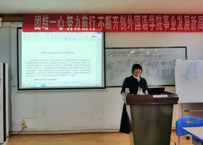 邓梦林老师首先分析了现有动词分类研究中存在的问题,与大家重新考察了动词体分类的语义标准后尝试对动词进行新的体分类,最后分析了新分类标准的科学性。讲座结束后,与会教师就汉语词类划分等话题进行了深入讨论。