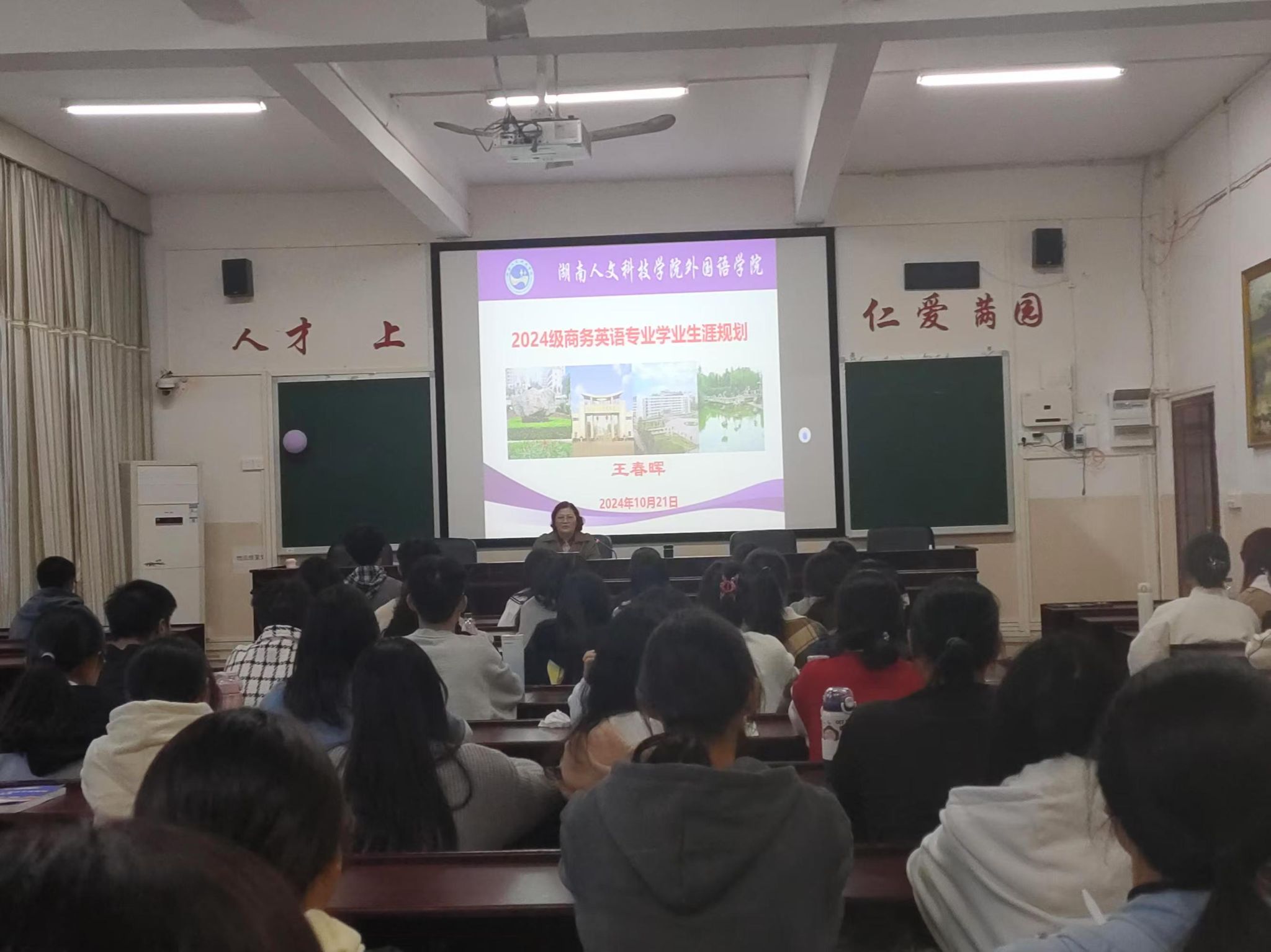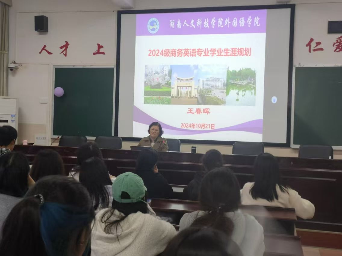 10月21日,外国语学院在播馨楼406会议室举办了商务英语专业学业规划专题讲座,旨在帮助商务英语专业新生提前做好大学四年学业规划,为未来的职业发展奠定坚实基础。此次讲座由商务英语专业带头人王春晖老师主讲,2024级商务英语专业全体学生参加。