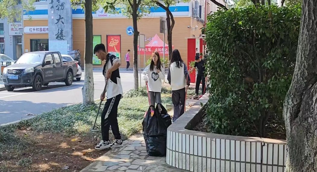 温暖阳光之下,同学们认真对待此次劳动,每一位同学都在自己的岗位上有条不紊地工作着。同学们相互配合、互帮互助,将绿化带之间的树叶和垃圾清理完毕。