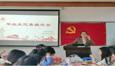 清荷花香,杨柳依依,又是一年毕业季。2022年5月23日下午,外国语学院在播馨楼301举行了毕业生代表座谈会。外国语学院党总支书记阳立新、党总支副书记罗嗣安、辅导员龙立平、曹瑜虹、朱倩与37名毕业生代表围坐一起,交流收获,展望未来。座谈会由罗嗣安主持。