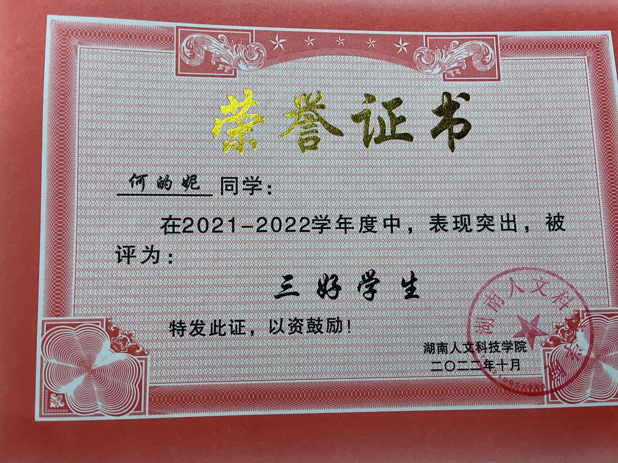在学习上,她严格要求自己,锐意进取、永不自满,从未放松对专业知识的学习,大学四年的专业成绩均保持在年级前二十,并在2022年荣获“三好学生”称号。当然她也不止步于此,努力考取专业证书如英语四六级、专四等。虽然在学习的道路上铺满了荆棘,满是坎坷,但她不会因此而退缩。反而一次的失败,既是一种挫折,更是一种激励,将引领她改过创新,递交一份更美丽的答卷。