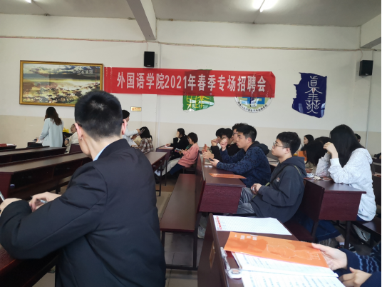 3月16日下午,外国语学院在播馨楼406举办了2021年春季第一场专场招聘会。参会招聘单位有猿辅导、爱迪文小新星国际教育、湖南只迷英语。学院党总支副书记刘莉、就业专干及英语专业60余名毕业生参加了招聘会。