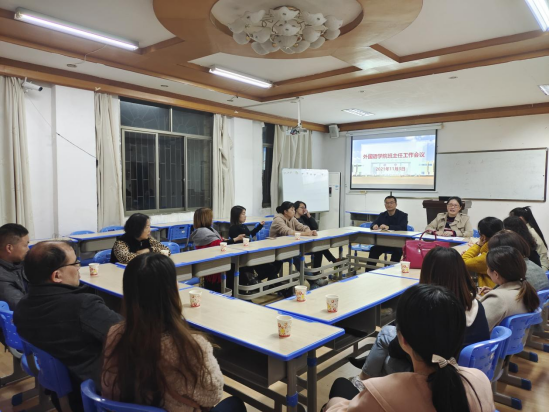 2021年11月3日晚,外国语学院在播馨楼301召开班主任工作会议,院党总支书记阳立新、全体班主任、辅导员参加,会议由党总支副书记罗嗣安主持。