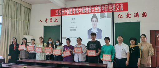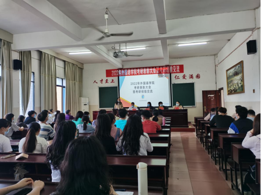 4月26日下午,2022年外国语学院考研表彰大会暨考研经验交流以线上线下相结合的方式在播馨楼406举行,学院党政领导、优秀教师代表和各年级学生代表共130余人参加了本次活动。