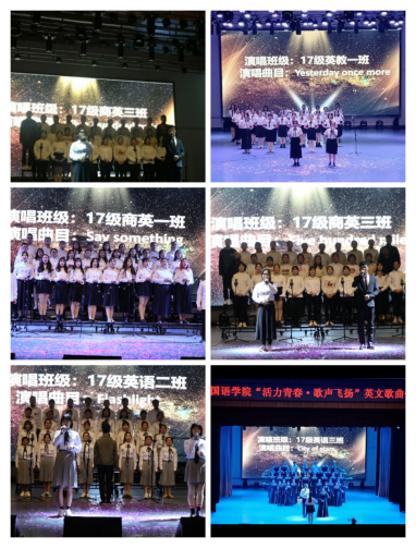 一首来自《幻乐之城》星空与音乐交织的《City of stars》奏响比赛旋律。深情的伴舞,温暖的旋律,《Five hundred miles》柔软了听众的心,而同样演绎思乡之愁的《far away from home》,则以欢快激昂的曲调给人耳目一新的感觉。无法成为超级英雄,但愿能守护所爱, 《Something just like this》娓娓道来。感恩陪伴,感谢师友家人的支持, 《You rise me up》、《A Little love》温情诠释。人生充满坎坷,或迷茫或疲惫,但最终我们冲破藩篱,直济沧海,《Unpredictable》、《Say something》、《If I stay》、《Hey Jude》见证这一系列的心路历程。通过视频追忆曾经一同已经度过的大学时光,铭记青春,《Yesterday once more》、《Take me to your heart》、《Flash light》、《My love》系列歌曲致敬经典,引发观众情感的共鸣。谢柳部长深受感触,在节目点评环节声情并茂地为大家演唱了大学毕业典礼上的英文合唱歌曲《斯卡布罗集市》,引爆全场气氛。谢部长充分肯定了此次活动的意义,指出本次英文歌曲合唱充分地展示了外国语学院“221晨间职训”的成果,体现了外国语学院学子积极向上的精神风貌和优良学风。