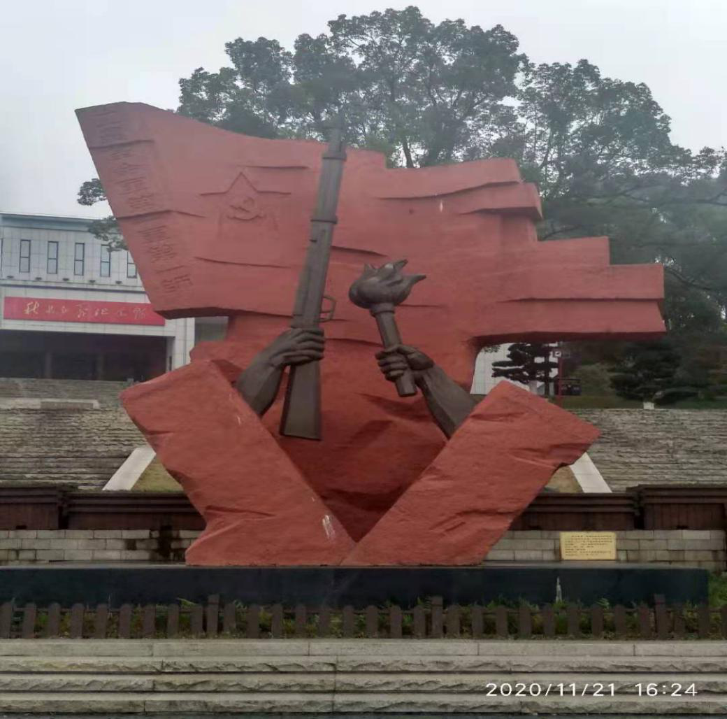 纪念馆前有一座巨大的红旗雕塑,黑色的大理石基座上,一面鲜艳的红旗迎风飘扬,红旗前面是一个代表胜利的 V字造型,红旗和 V字中间是两只紫色的手臂, 一手举着一枝步枪,一手高擎着火炬。雕塑象征着秋收起义那段光辉的岁月。