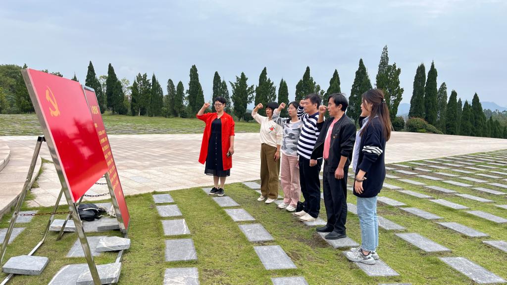 在湘江战役烈士纪念碑和烈士陵园,面对无数为中国革命牺牲的先烈,学报编辑部党员庄严宣誓:接过红军的旗帜,建设好伟大的祖国,为祖国的繁荣富强贡献自己的力量。