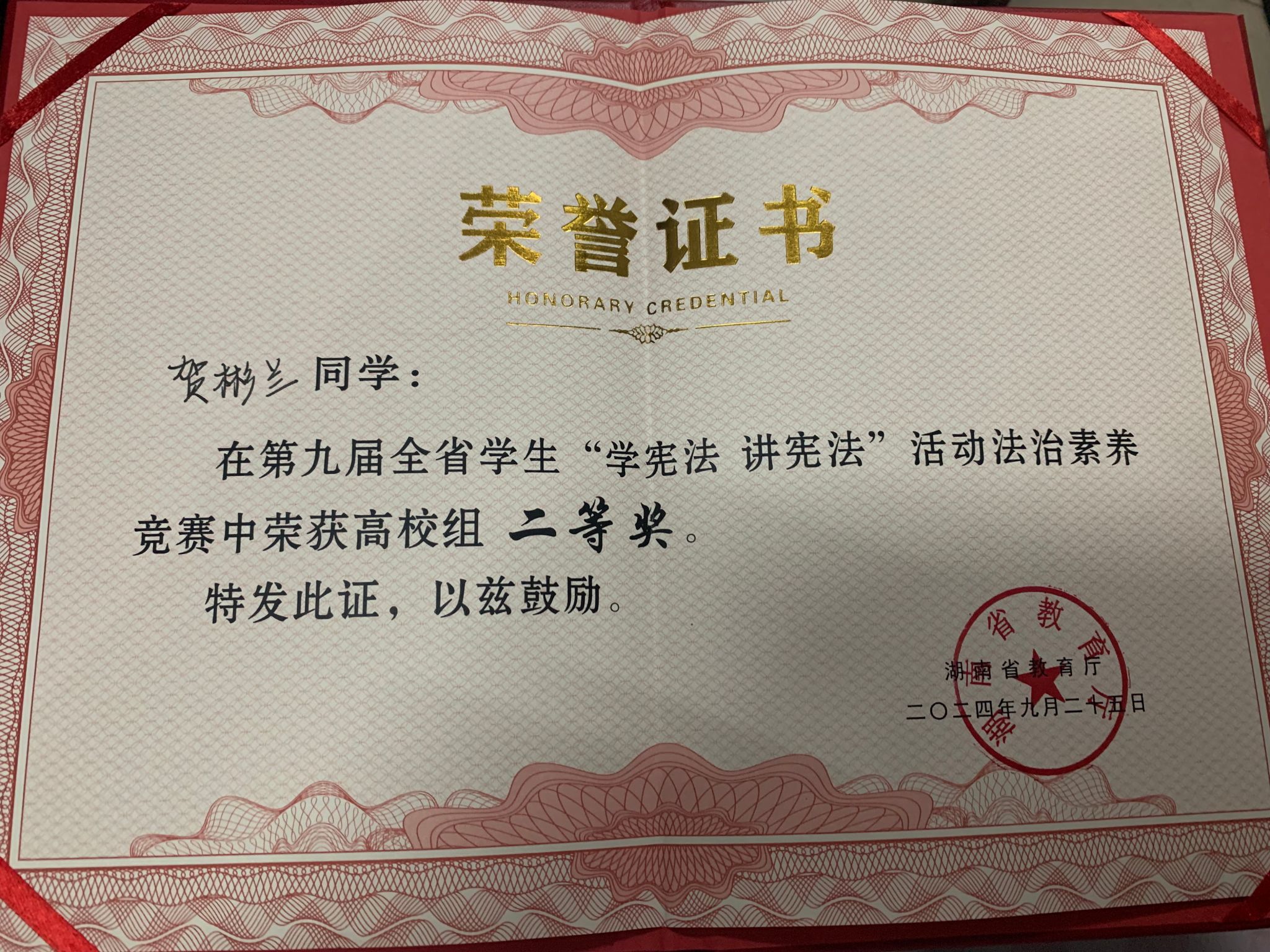 第九届全国学生“学宪法 讲宪法”活动高校组湖南赛区总决赛于2024年9月25日在湘潭大学圆满落幕。KY官网法学院贺彬兰同学荣获“学宪法 讲宪法”活动法治素养比赛湖南省二等奖。