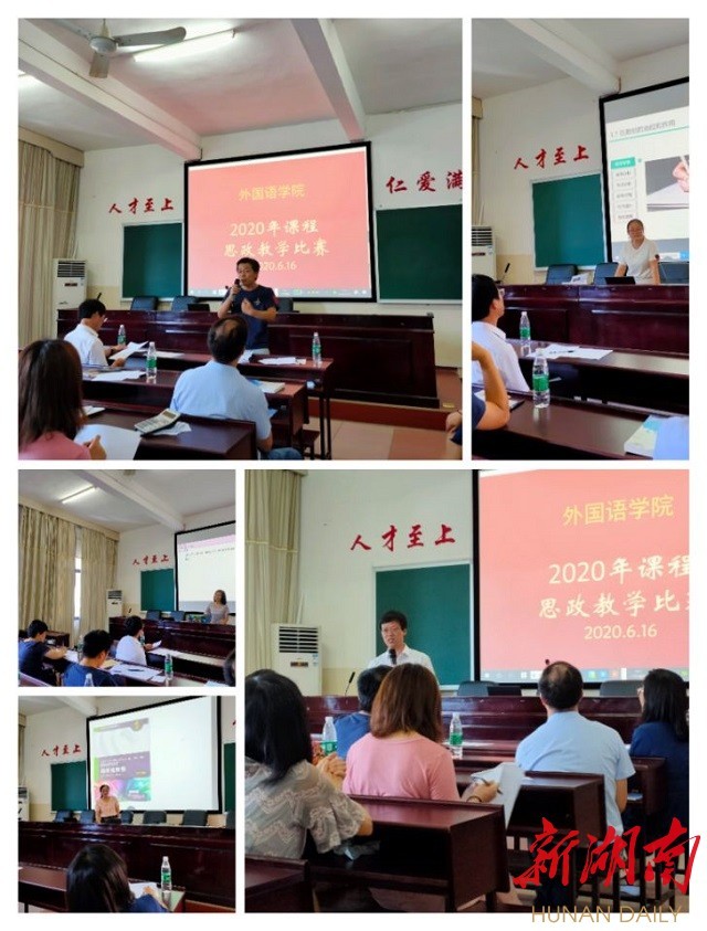 湖南日报·新湖南客户端6月18日讯(通讯员 胡瑾)为进一步挖掘外语课程中蕴含的思政元素,大力推动以“课程思政”为目标的课堂教学改革,全面提升学院教师课程思政教学能力,6月16日,KY开元集团官网入口外国语学院7名教师个人或团队进行了一场外语课程思政教学比赛。法学院院长朱耀斌教授和马克思主义学院谢科峰博士担任特邀评委。