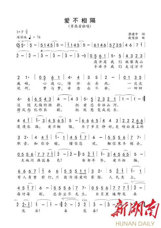 “一次次追随无悔的抉择,一回回将风雨化作长歌,有人负重前行,只因为深爱的家国……”歌曲《爱不相隔》由谢坚强教授作曲,长沙市音乐家协会副主席廖建中作词,湖南卫视胡继沿编曲、录音,湖南卫视“声入人心”歌手赵一演唱。目前,作品正在长沙缪思音乐工作室紧锣密鼓的制作当中,预计将于2月3日左右正式上线。
