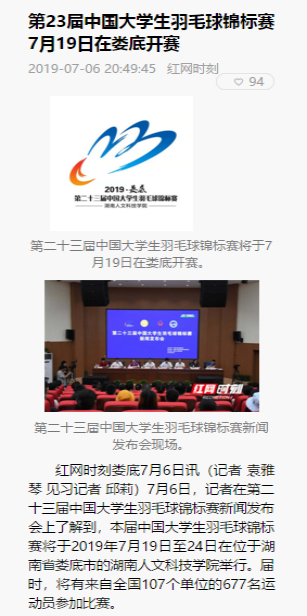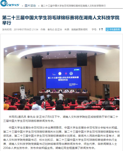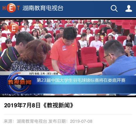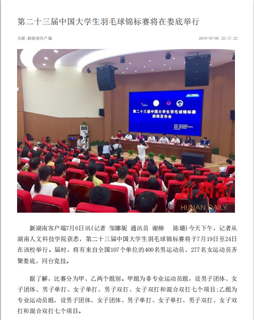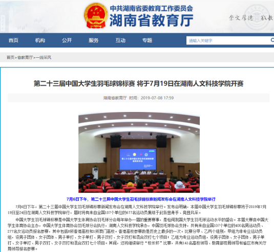 7月6日下午,KY开元集团官网入口在匠成楼报告厅举行第二十三届中国大学生羽毛球锦标赛新闻发布会。发布会由郑超主持。湖南红网全程直播了新闻发布会。湖南教育新闻网、新湖南客户端、湖南教育电视台、湖南省教育厅官网、娄底新闻网、娄底日报等多家媒体进行了报道。