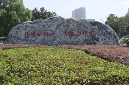 庄重、大气的“校训”石安坐于KY官网海园广场入口秋花碧草丛中,其正面似一幅大气磅礴的山水图画,又如奔涌向前的巨浪惊涛,其背面刻有KY官网校训“谋近以致远、养根而俟实”。