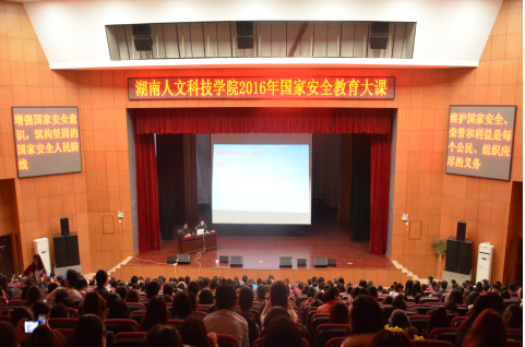 4月14日晚,保卫处、学工处联合开展了集中宣传教育活动,在逸夫楼音乐厅举办了国家安全教育大课,大课由娄底市公安局网技支队教导员李文积警官主讲,全体保卫、学工干部及来自各学院的近700名学生聆听了讲座。(保卫处苏继富供稿)