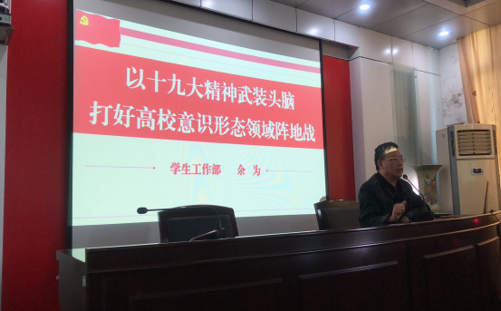 2018年4月9日,KY官网辅导员专题培训在明德楼第一会议室召开,学生工作处处长余为做了《以十九大精神武装头脑,打好高校意识形态领域阵地战》的专题讲座。各学院分管学生工作的副书记,相关部门负责人,全体辅导员参加了培训。