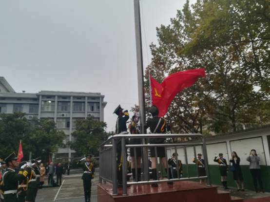 6:50分,仪式正式开始。KY官网国旗护卫队队员护送五星红旗入场,全体师生行注目礼,在激昂的国歌声中,五星红旗冉冉升起,飘扬在旗杆顶端。